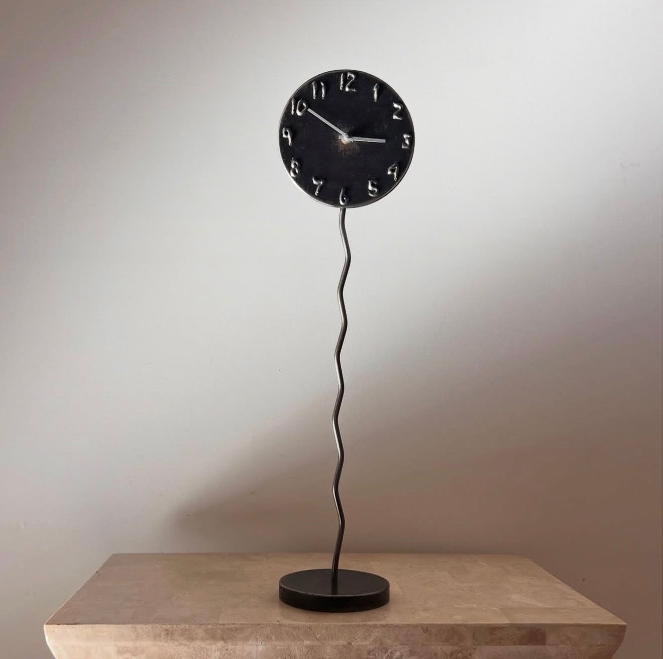 « Postmodern Form and Reform », a piece by Jon Sarriugarte. A welded metal clock with battery operated mechanism on verso. Works like a dream as a functioning clock; battery operated.