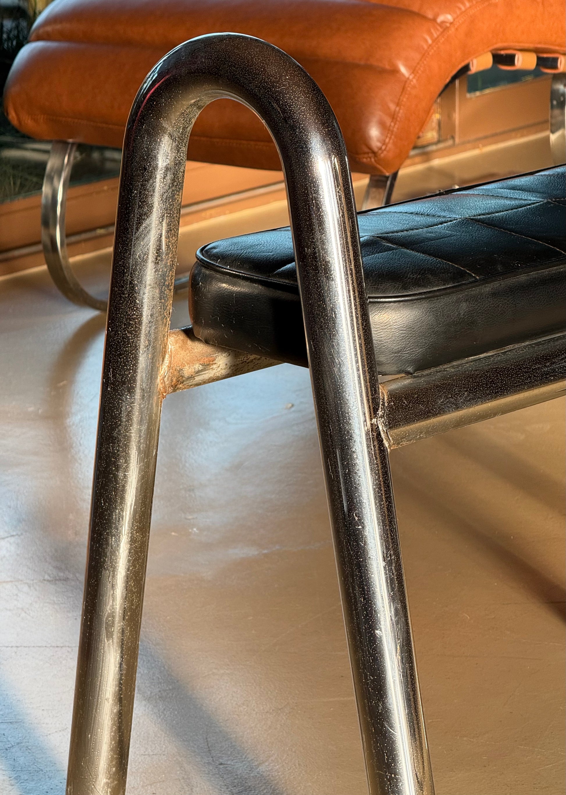 Bauhaus sensibilities featuring thick tubular chrome frame and black pleather seat. Wear includes rust to the chrome and general wear to the upholstery.