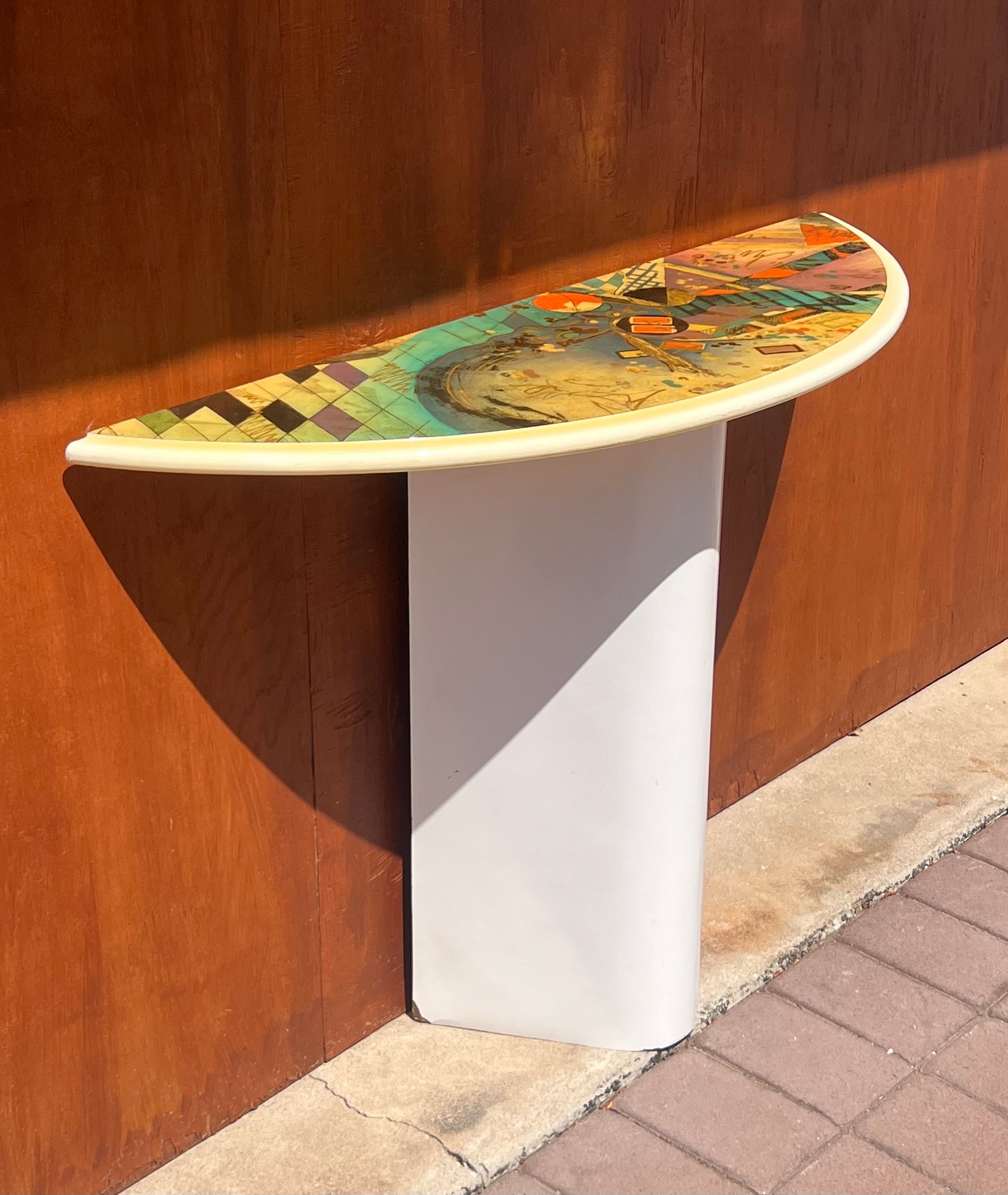 A striking and very unique matching set including a Demi-lune console and eye-shaped mirror with colorful postmodern motif. Each piece is lacquered wood, and the mirror is ready to hang. Minor signs of wear consistent with age, including nicks to the lacquer and general wear.